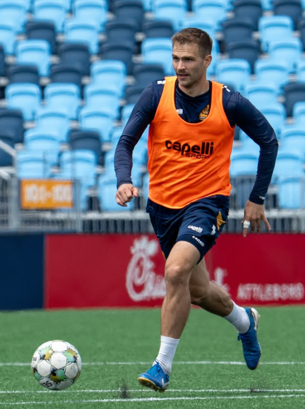 Grant Stoneman looks to make a pass during Rhode Island FC training. Image Courtesy of RIFC.
