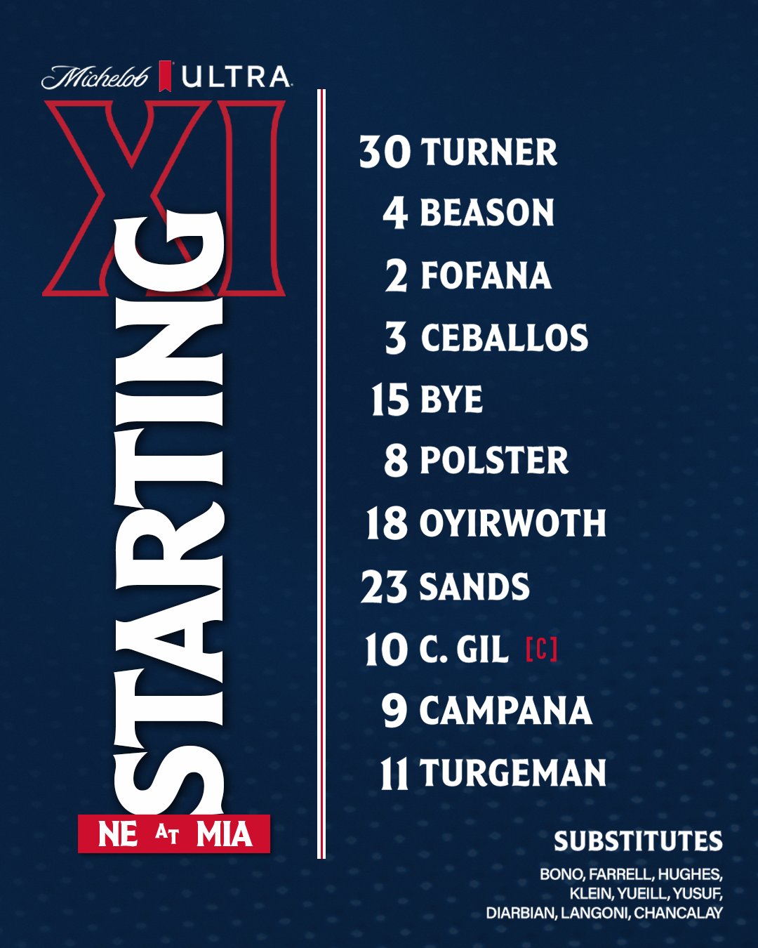 New England starting lineup: 3-5-2 | Matt Turner, Will Sands, Tanner Beason, Brayan Ceballos, Mamadou Fofana, Brandon Bye, Matt Polster, Allan Oyirwoth, Carles Gil (C), Leo Campana, Dor Turgeman