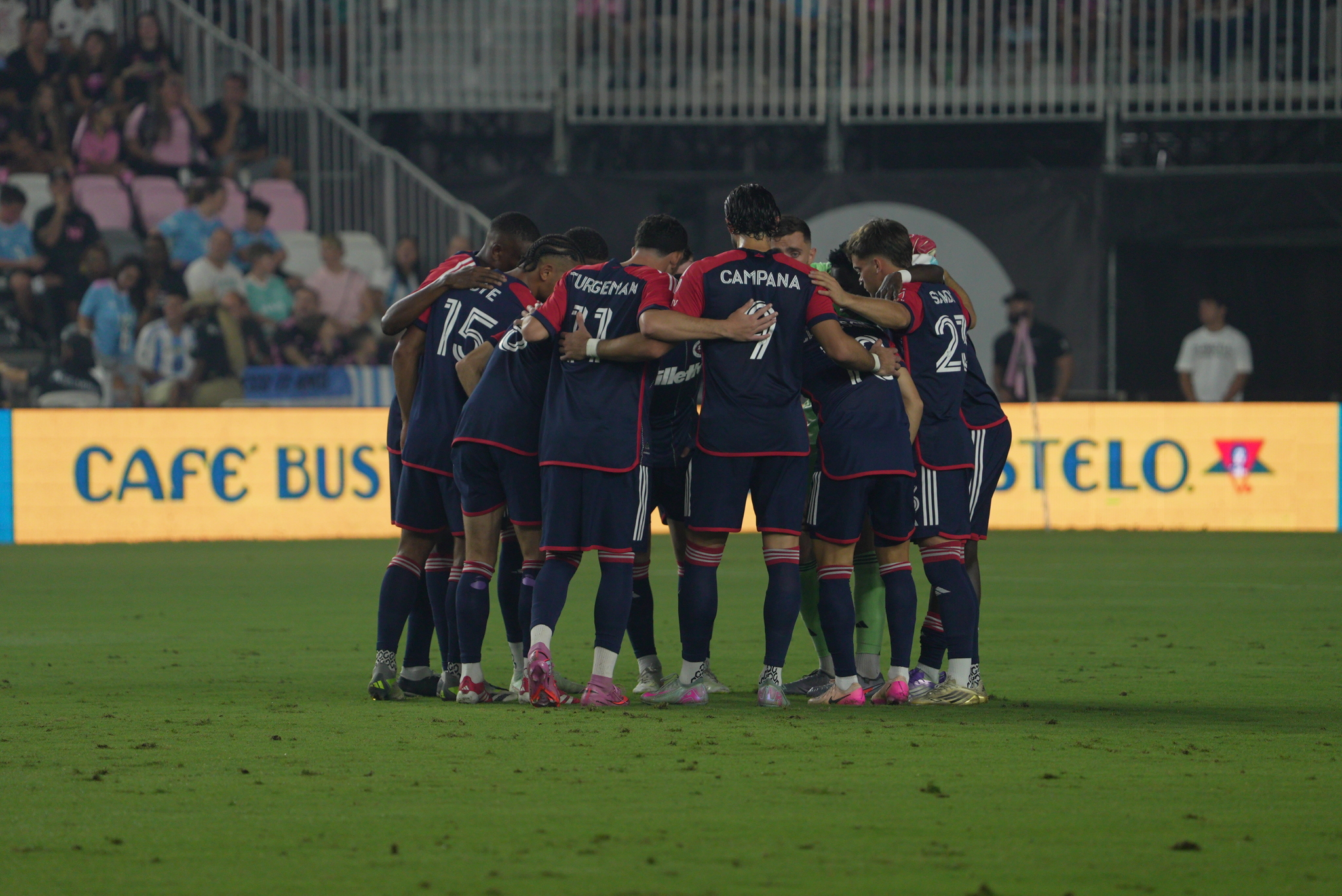 New England Revolution huddle prior to an MLS match versus Inter Miami CF. Image Courtesy of New England Revolution.