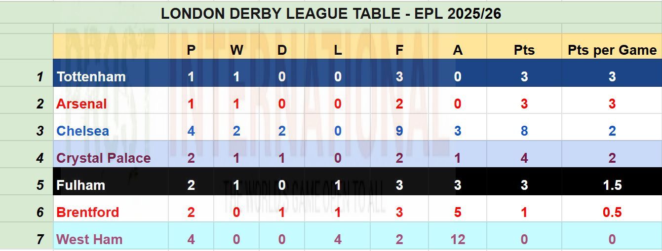 With three points per game, they are level with Spurs while West Ham now have four straight derby losses. Brentford are the only other side without a derby win.