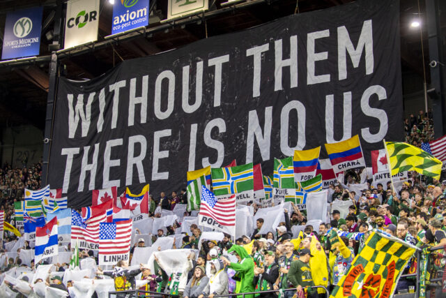 It was a busy day in Portland, the “No Kings March” that had gathered earlier a 40,000 strong march in Downton Portland, and the evening brought the MLS Season finale for the first ever visit of MLS expansion franchise, San Diego FC. The festivities started with the display of a tifo in support of immigrants, “Without Them, there is no US”, in reference at the majority of non-US players in the current Timbers squad, and as a larger metaphor for immigrant rights.