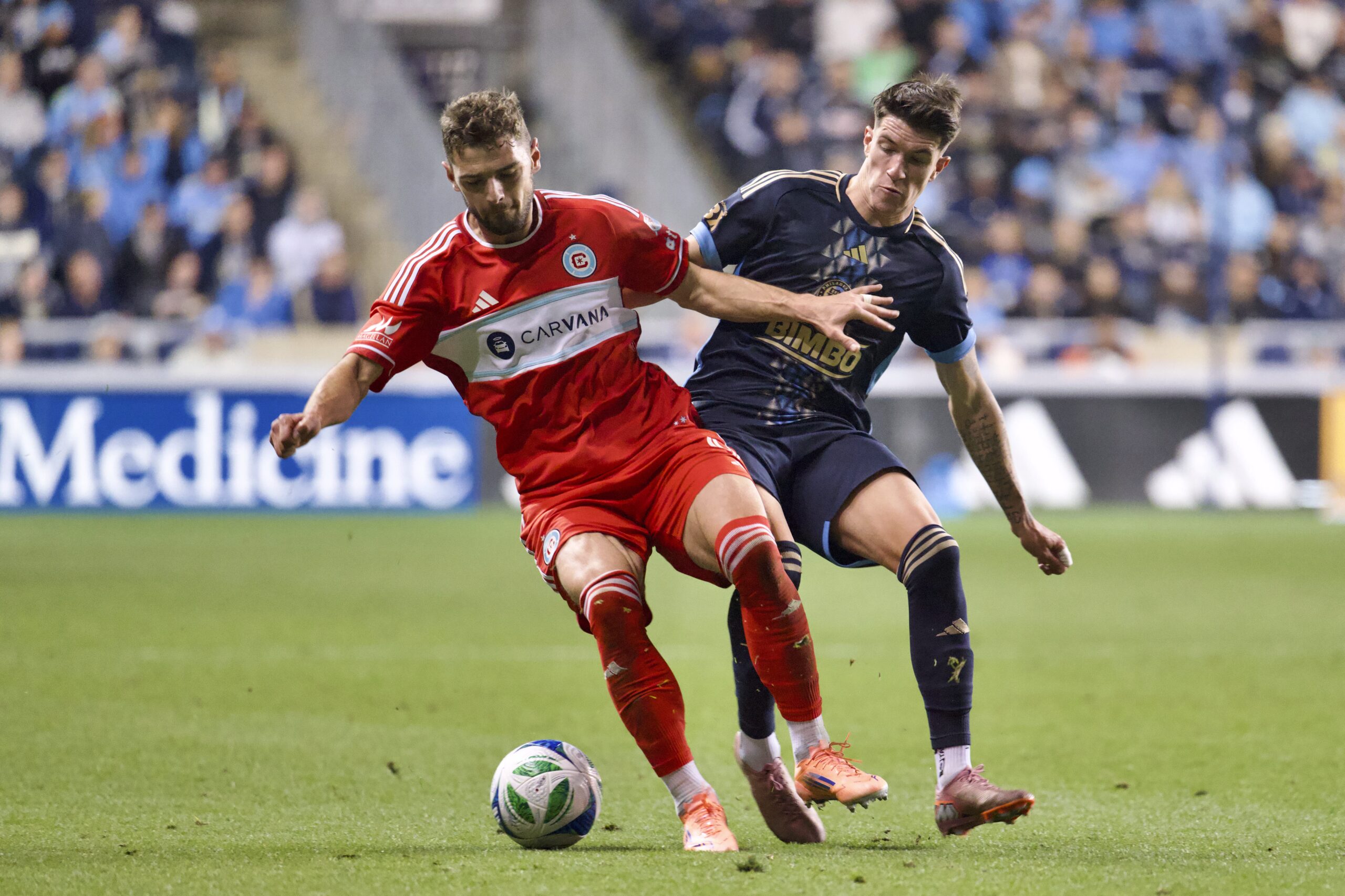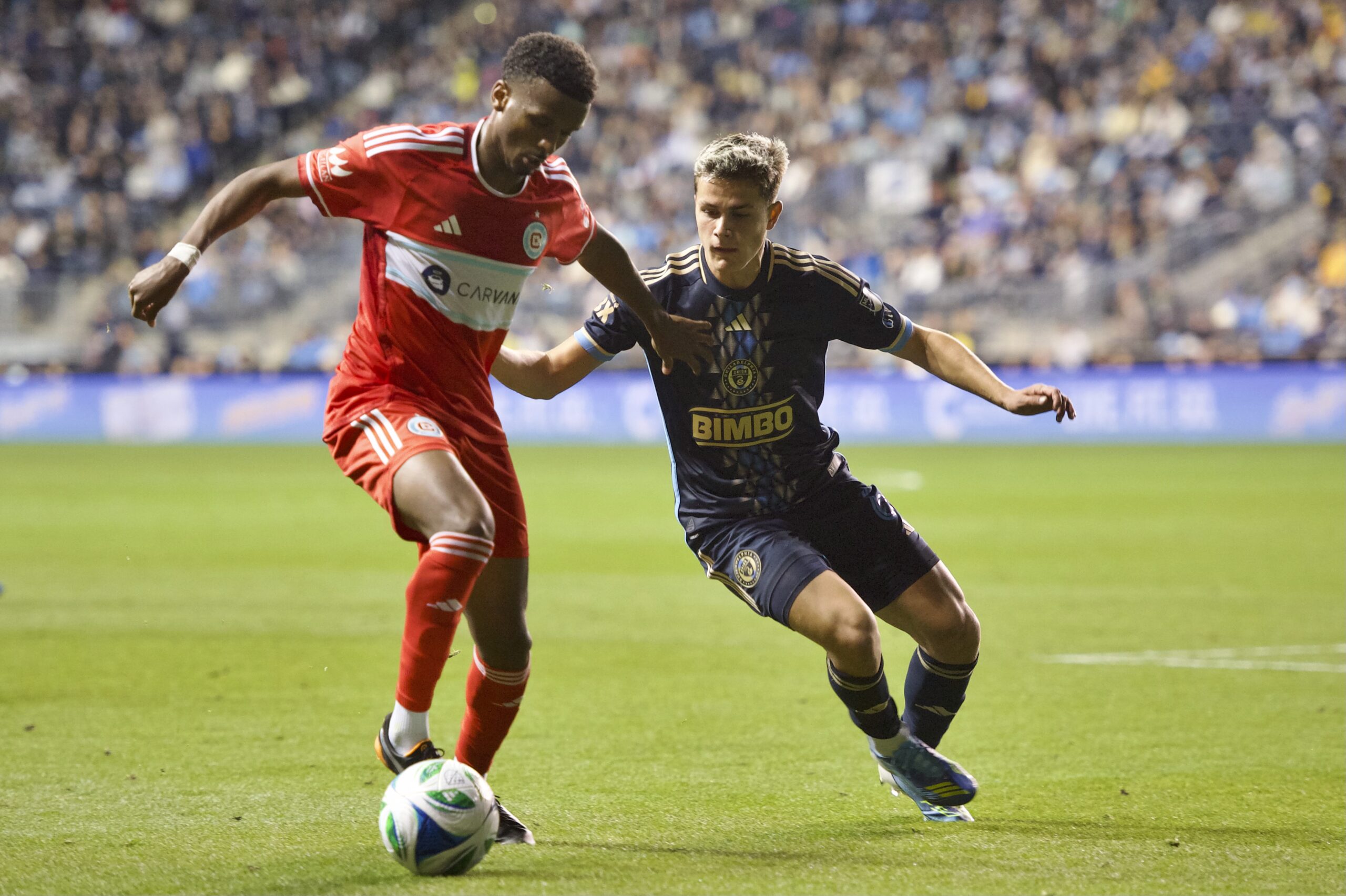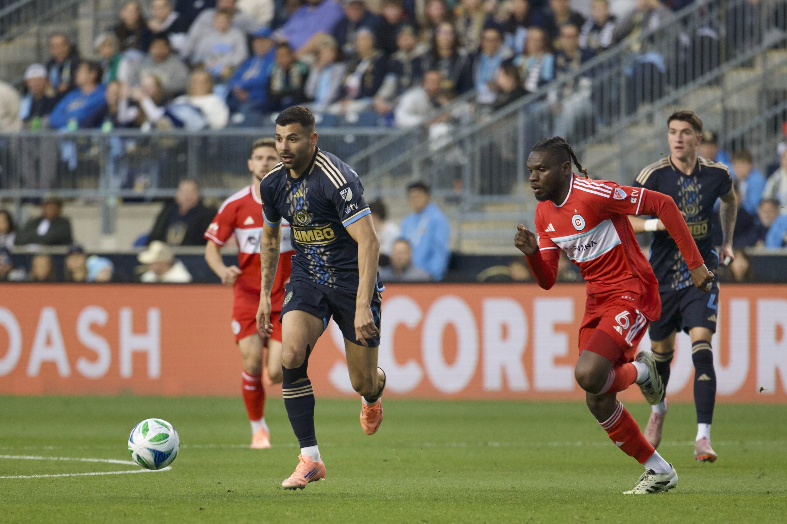 Philadelphia’s Tai Baribo leading the way past Chicago’s Rominigue Kouamé.