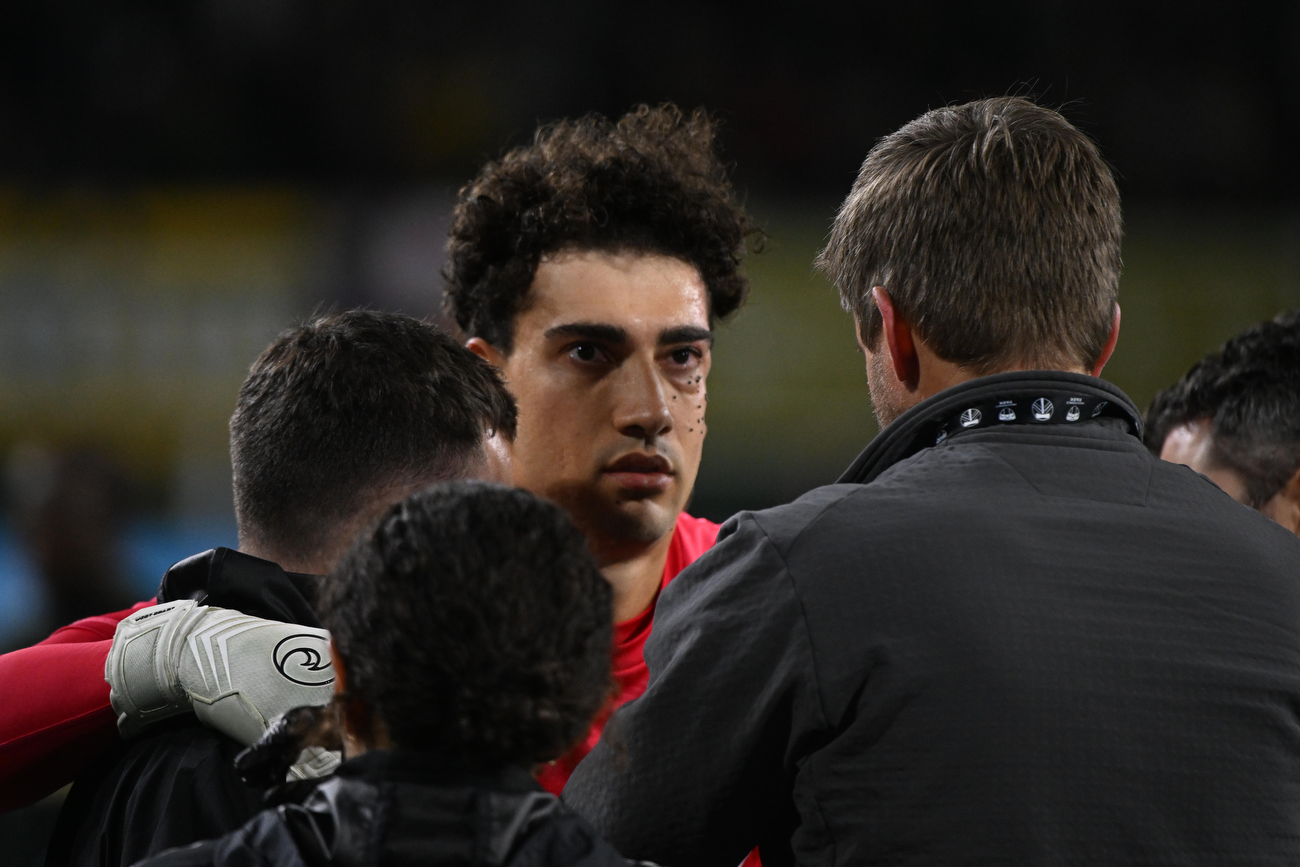 Kristoffer Velde recriminates San Diego substitute keeper Pablo Sisniega’s premature celebrations after scoring in the penalties definition (photo by Diego G Diaz).