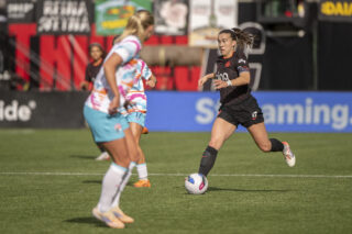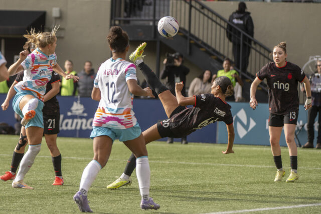 Reilyn Turner scores the lone goal of the  NWSL first round of Playoffs San Diego Wave at Portland Thorns at Providence Park (Photo by Diego G Diaz).