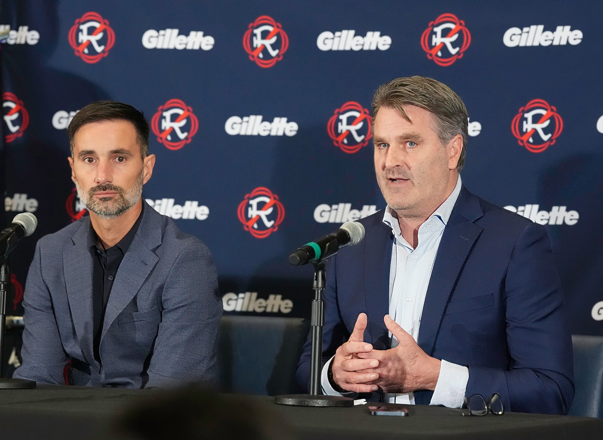 Curt Onalfo addresses the media during New England Revolution official introduction of Marko Mitrovic as the Club’s 10th Head Coach on Wednesday, November 12, 2025, at Gillette Stadium in Foxboro, MA. CREDIT/ CHRIS ADUAMA.