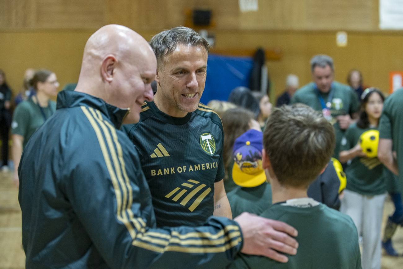 Peninsula Elementary School (K-8) was full of green and gold tee shirts and excited chatter as students wearing new Portland Timbers gear filled the gym. The Timbers held a press conference this morning to announce their new front of kit sponsor, followed by a soccer clinic for the kids with head coach Phil Neville, Timbers’ legend Diego Valeri, and goalkeeper Trey Muse.