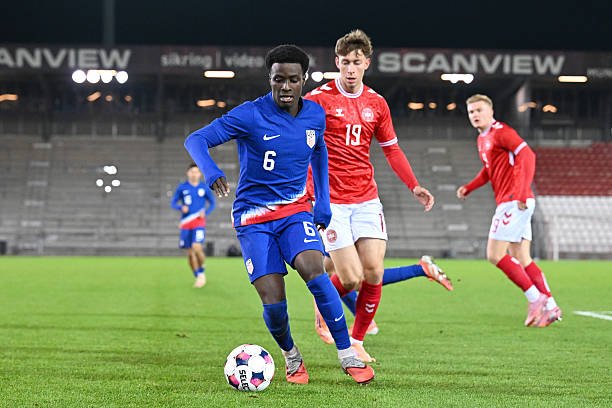 VEJLE, DENMARK – NOVEMBER 14: Brooklyn Raines of USA running with the ball during the U21 International friendly match between Denmark and USA at Vejle Stadion on November 14, 2025, in Vejle, Denmark. (Photo by Patrik Lundin/USSF/Getty Images)
