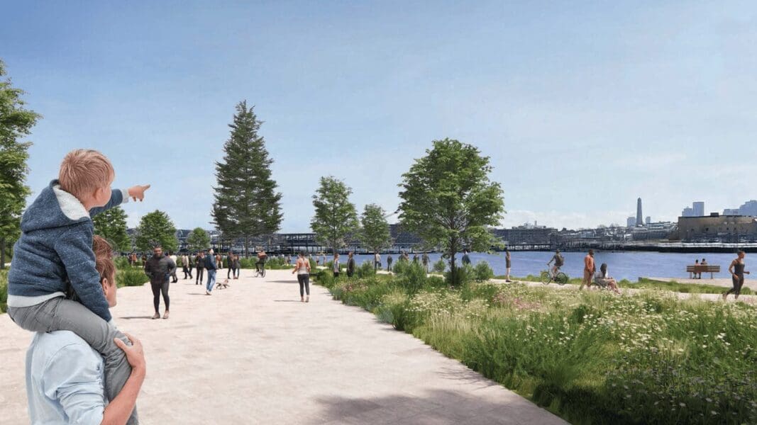 Illustrative Renderings that do not reflect the final design of the waterfront park by The Kraft Group. Image Courtesy of The Kraft Group.