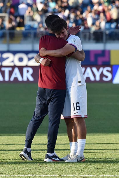 RANCAGUA, CHILE – OCTOBER 12: Marko Mitrovic, Head Coach of USA, comforts Ethan Kohler of USA after the team’s defeat in the FIFA U-20 World Cup Chile 2025 quarter-final match between United States and Morocco at Estadio El Teniente on October 12, 2025, in Rancagua, Chile. (Photo by Claudio Santana/USSF/Getty Images)