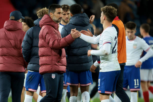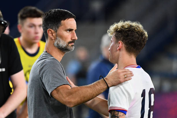KANSAS CITY, KANSAS – JUNE 11: United States U-23 head coach Marko Mitrović greets Griffin Yow #18 of the United States U-23 after playing Japan U-23 at Children’s Mercy Park on June 11, 2024, in Kansas City, Kansas. (Photo by Bill Barrett/ISI Photos/USSF/Getty Images for USSF)
