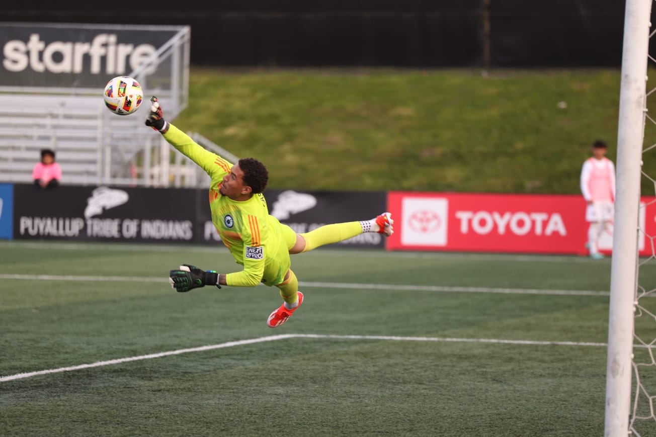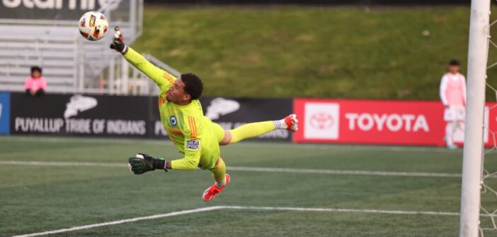 Jacob Castro makes a save for Tacoma Defiance. Image Courtesy of Seattle Sounders FC.