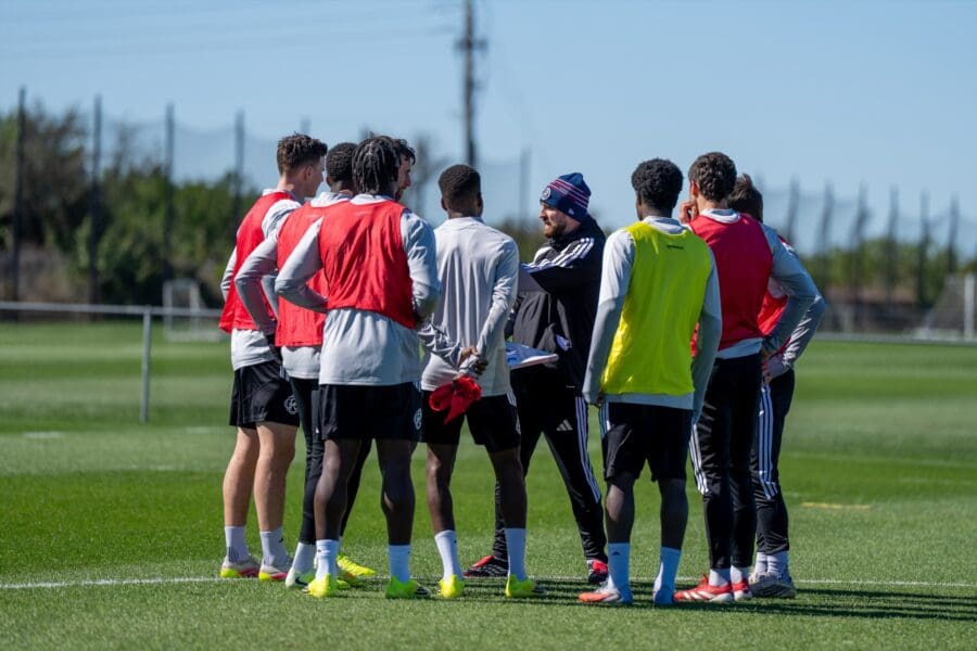New England Revolution Assistant Coach Michael Morris gives instructions to the squad during a preseason training session in Florida. Image Courtesy of New England Revolution.