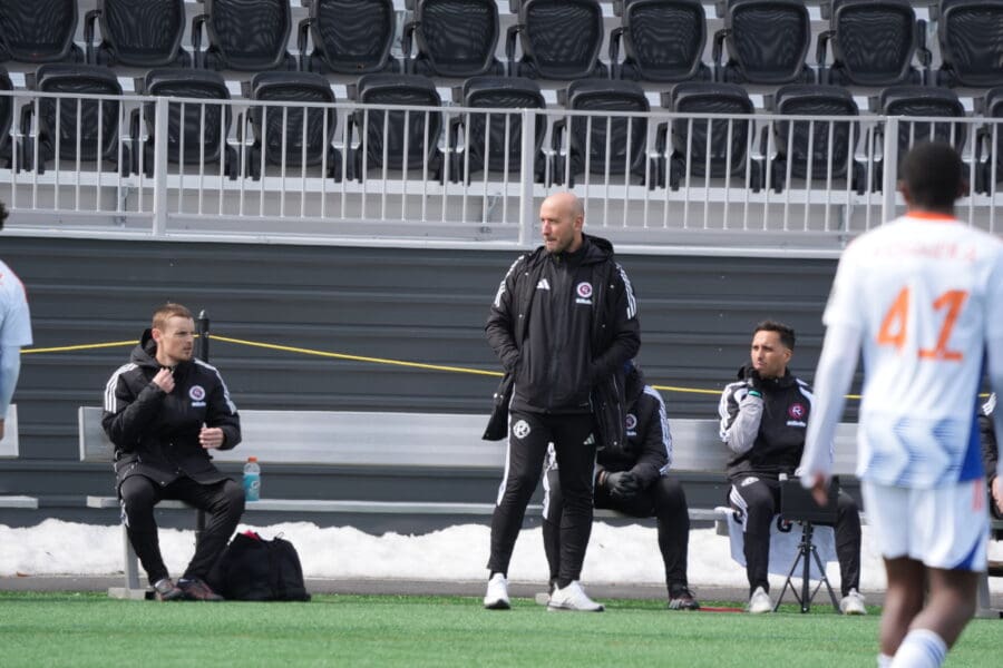 Revolution II head coach Pablo Moreira looks on during an MLSNP match versus FC Cincinnati 2. Image Courtesy of New England Revolution II.