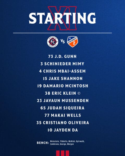 New England starting lineup: 4-3-3 | JD Gunn (C), Schinieder Mimy, Chris Mbaï-Assem, Jake Shannon, Damario McIntosh, Javaun Mussenden, Eric Klein, Judah Siqueira, Makai Wells, Cristiano Oliveira, Jayden Da